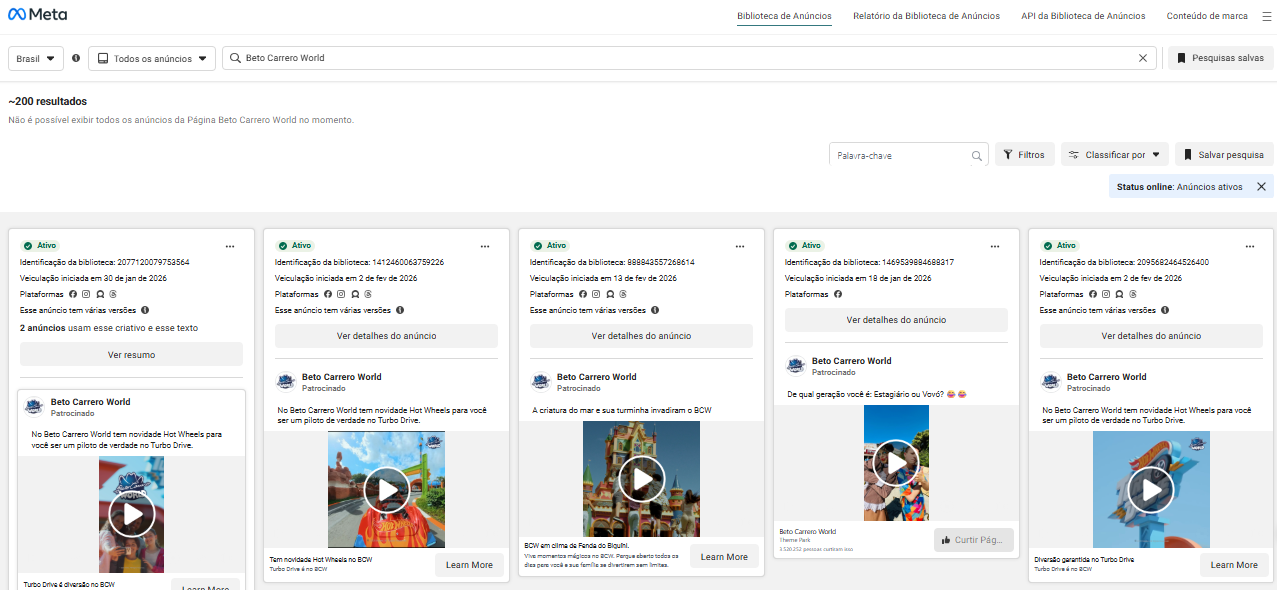Basta acessar a biblioteca, buscar por nome de página, empresa ou palavra-chave, e utilizar os filtros disponíveis para ver anúncios por data, país ou plataforma desejada. É possível analisar criativos, textos e datas de veiculação livremente.