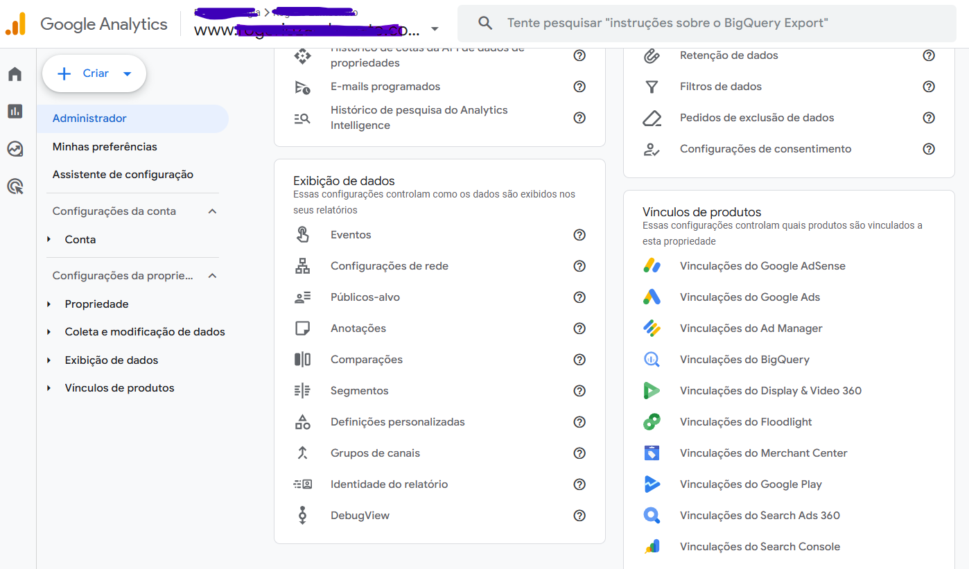 - No menu “Administração” do Analytics, escolha “Vinculações com Produtos” e clique em “Google Ads”.